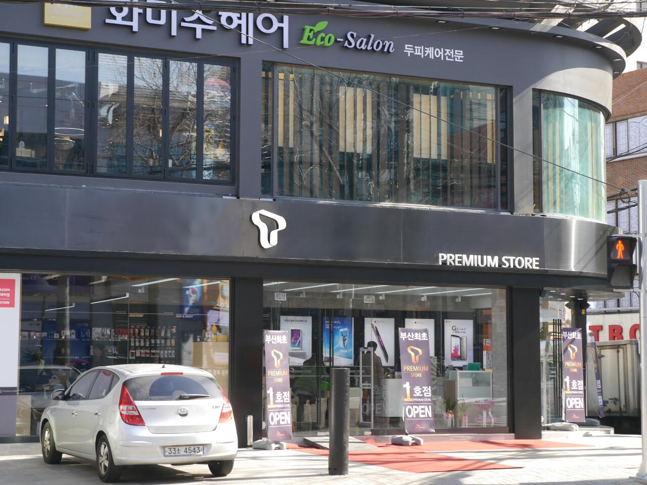 黒色のカラーステンレスを使った韓国の携帯ショップ